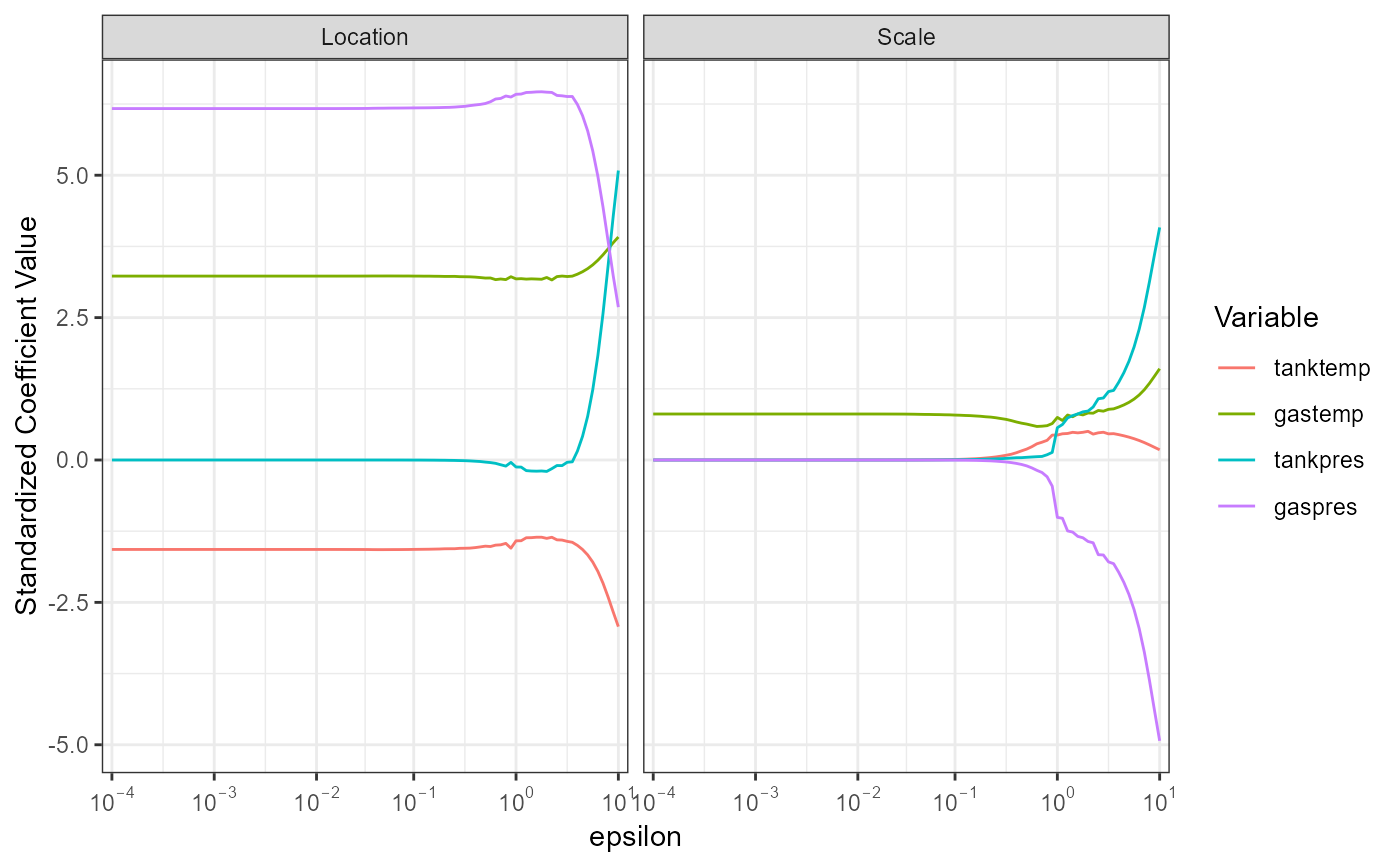 This function plots the standardized coefficient values with respect to the \(\epsilon\)-telescope for the location (and dispersion) components.